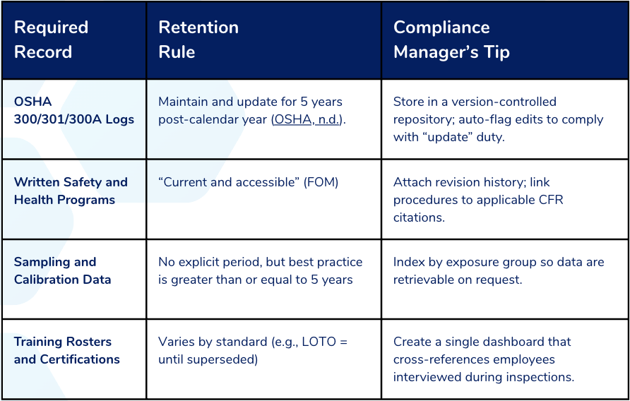 - Occupational Safety and Health Administration. (n.d.). 29 CFR 1904.33: Retention and updating. https://www.osha.gov/laws-regs/regulations/standardnumber/1904/1904.33