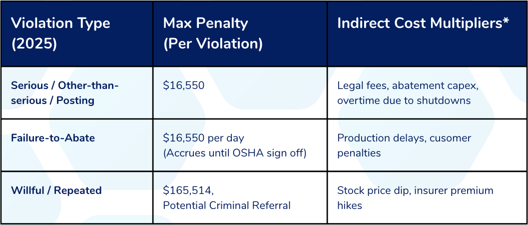 Sources: OSHA 2025 civil‑penalty memo (OSHA, 2025); Association of Corporate Counsel guidance on collateral litigation & contract impacts (ACC, 2017).