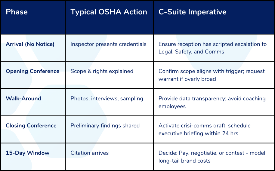 An unannounced OSHA visit is a live‑fire audit of operational excellence, brand integrity, and governance credibility. C‑suite executives who treat safety performance with the same rigor as financial controls transform inspections from high‑risk events into proof points of organizational resilience - and turn potential headlines into non‑events.
