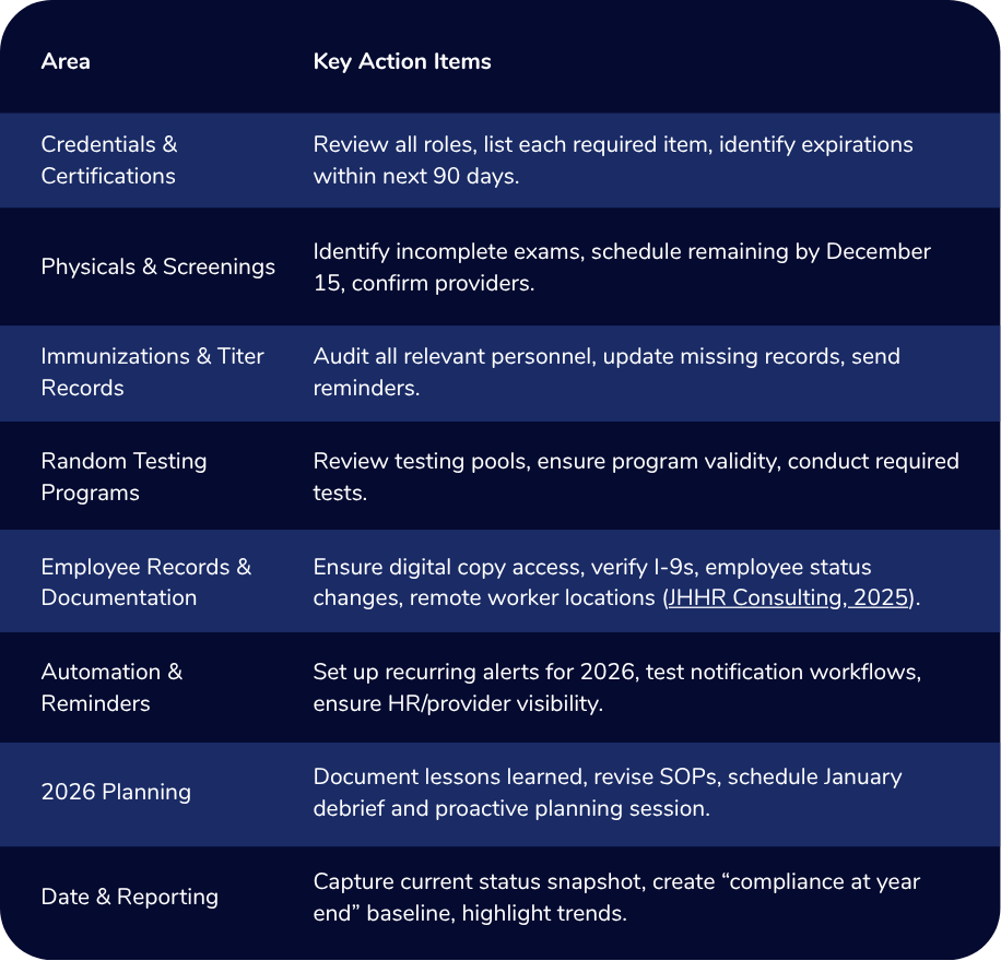 This practical year-end compliance guide helps HR leaders close out 2025 with confidence. Learn how to audit health records, renew credentials, automate reminders, and prep for 2026 regulatory shif...