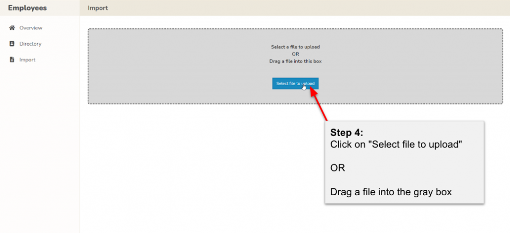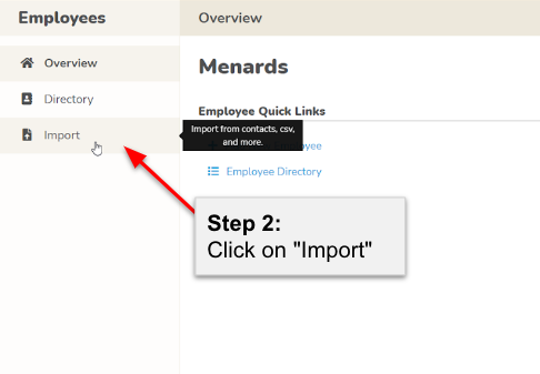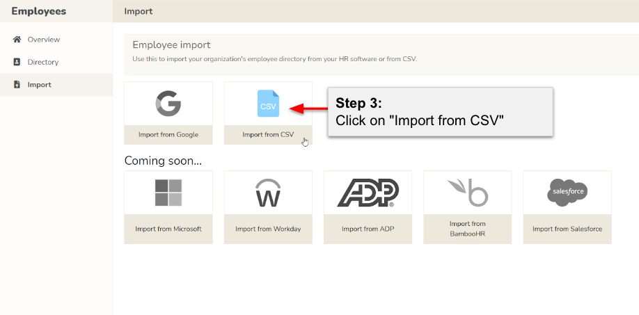 Within the Import options, click on "Import from CSV" to specify that you'll be uploading employee data in CSV format.