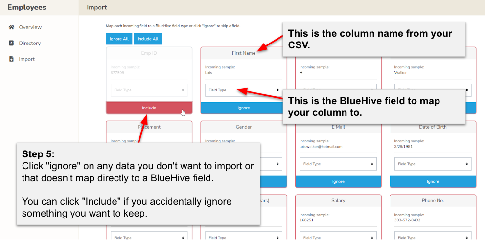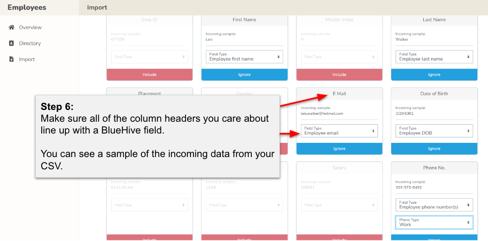Ensure all column headers in your CSV file align with the relevant BlueHive fields. A sample of the incoming data will assist you in this mapping process.