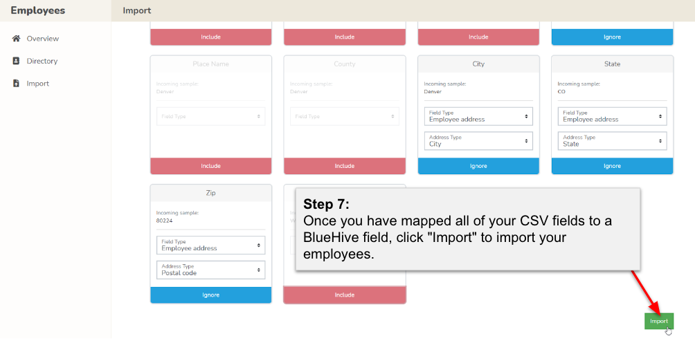 Once satisfied with your field mappings, click "Import" to initiate the seamless import of your employee data into BlueHive.
