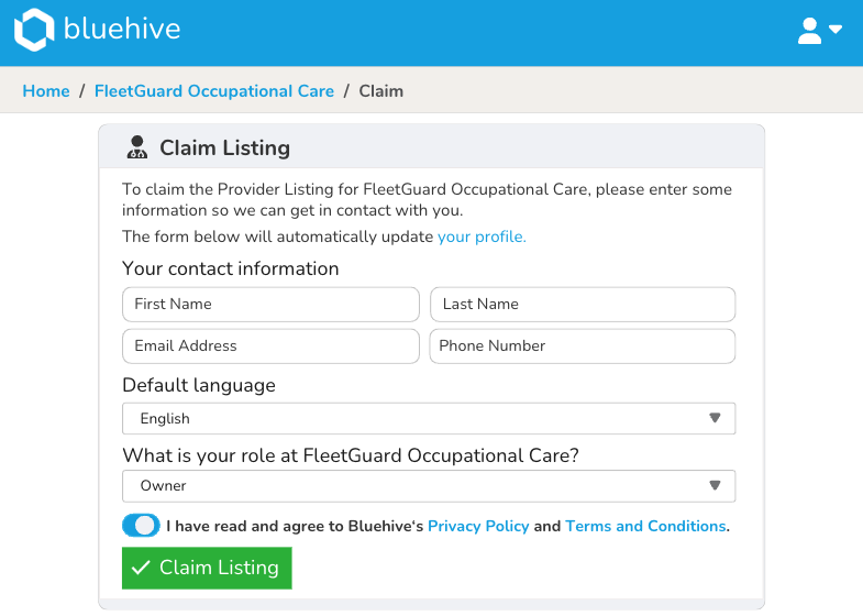 Dive into the next phase by filling out a simple form. Provide essential details such as your first and last name, email, phone number, job role, and default language. Ensure you've perused and acknowledged BlueHive's terms and conditions as well as privacy policy. Finally, click the claim listing button to initiate the process.